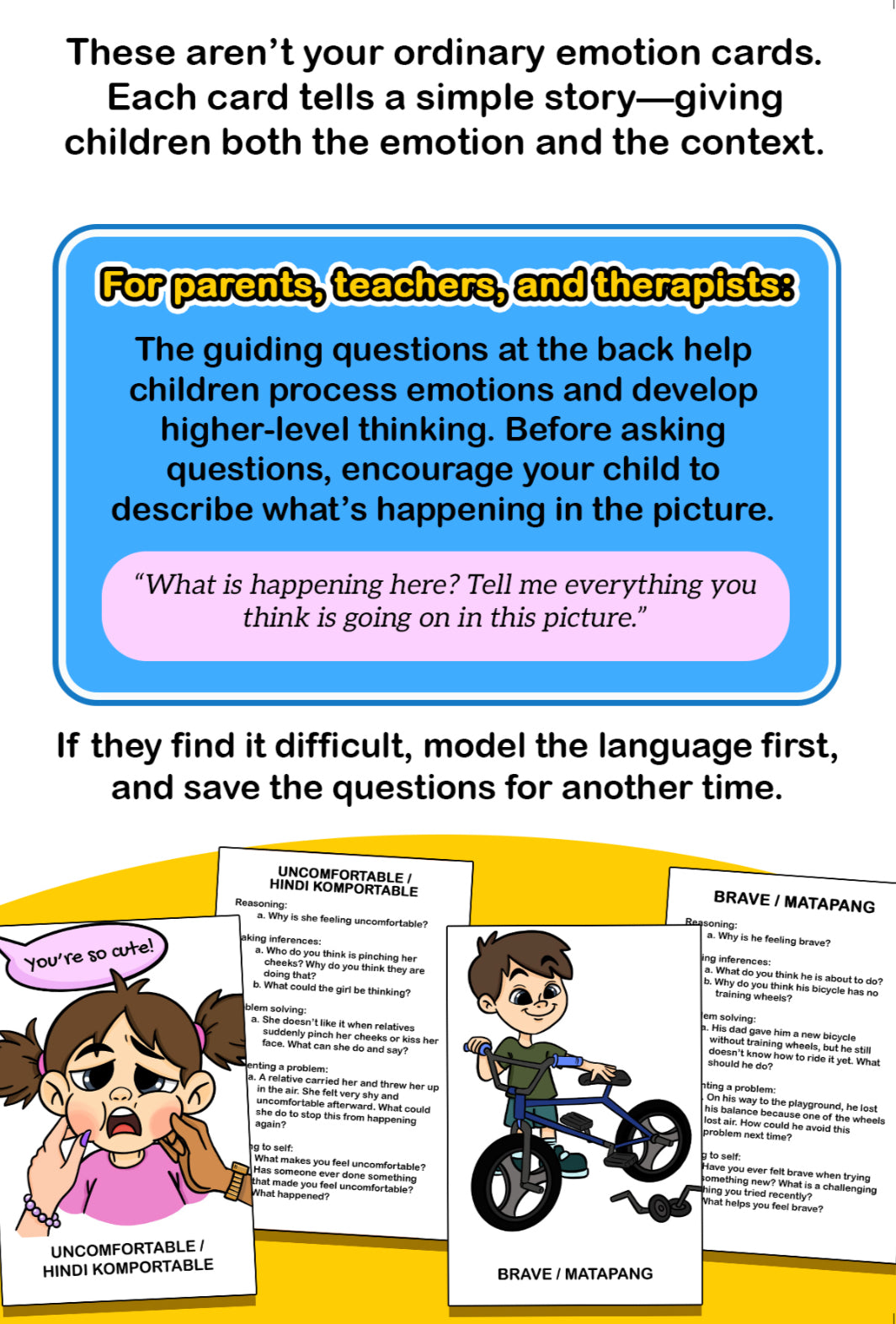These cards are designed to help children explore emotions and build stronger language skills — whether at home, in class, or in therapy.